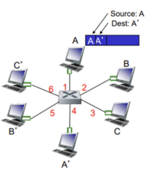 다시 위와 같은 상황을 보겠습니다. A가 A'에게 프레임을 보내는 상황입니다. Switch가 frame을 확인해 sender의 위치를 확인합니다. 지금은 A가 1번 port인 것을 확인하고 아래처럼 Switch Table에 저장한 것입니다.