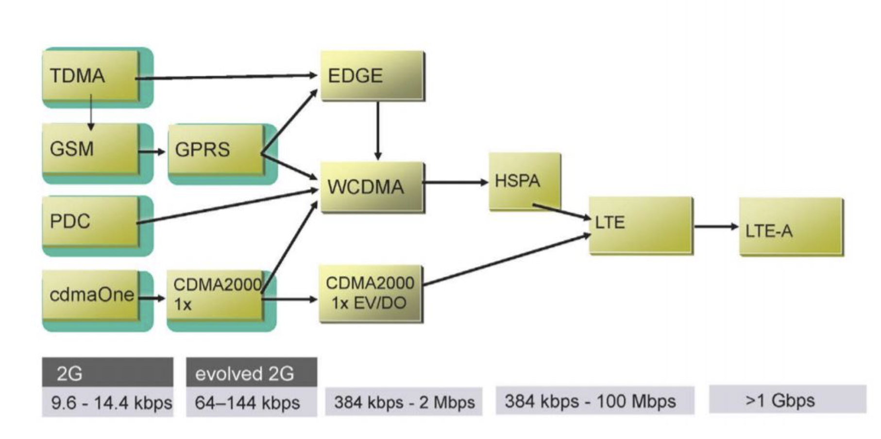 Cellular는 위 방식으로 발전을 해왔습니다. 전송 속도를 기준으로 2G, 3G, 4G로 나뉘었습니다.