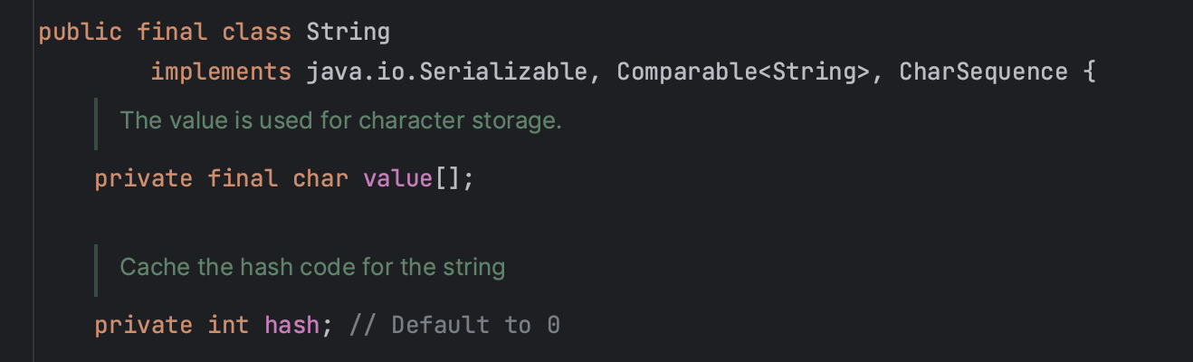 실제 String 객체의 내부를 들여다보면, 아래처럼 value 변수가 final로 선언된 것을 볼 수 있다.
