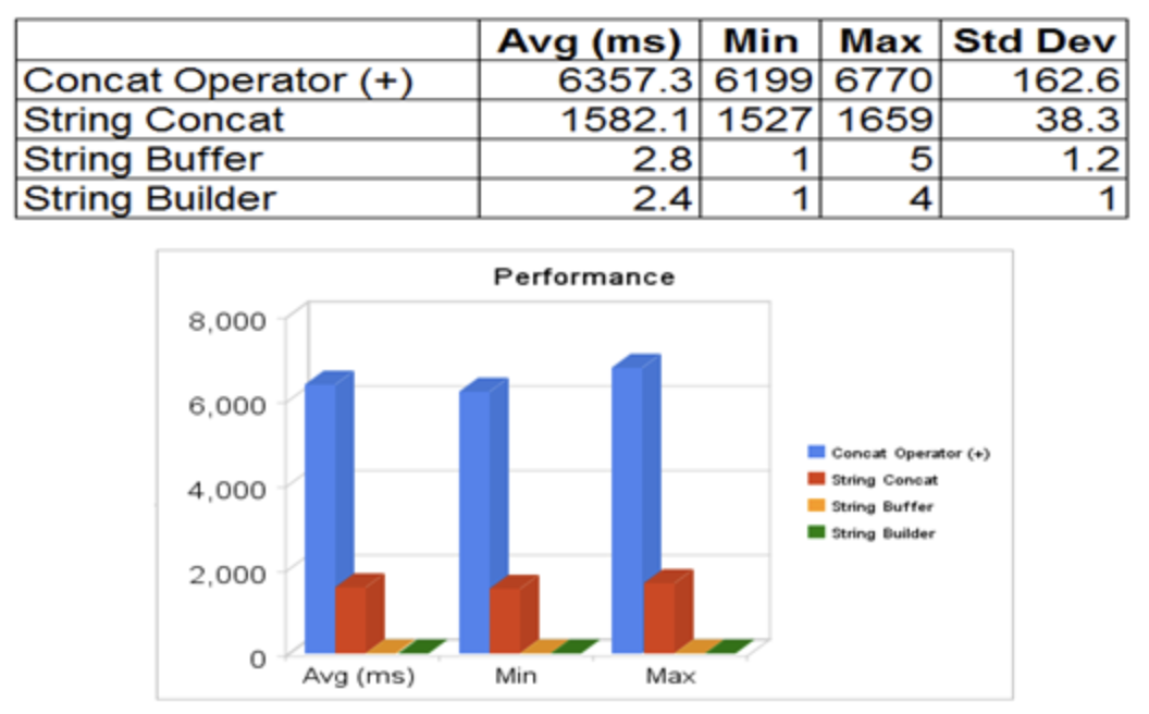 그래서, String.concat() 과 StringBuffer, StringBuilder의 성능은 아래처럼 확연한 차이가 나는 것을 볼 수 있다.