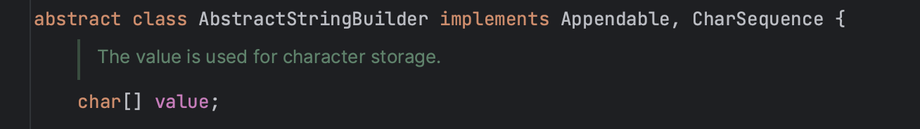 그리고 AbstractStringBuilder는 final 선언이 되어있지 않는 가변적인 구조라는 것을 알 수 있다.