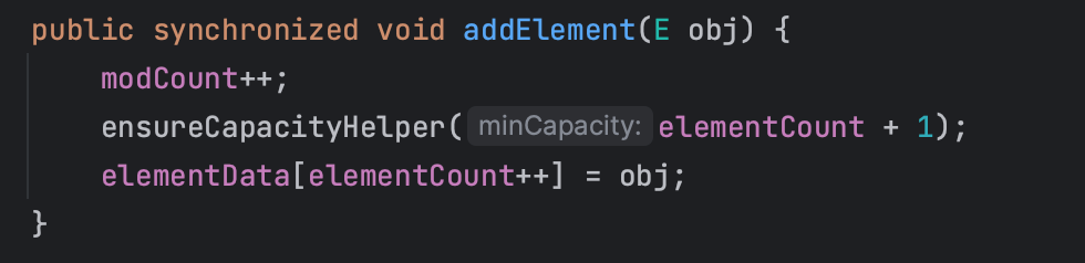 실제 벡터의 메서드 내부를 들여다보면, synchroized가 선언되어있는 것을 볼 수 있습니다. 그래서 두 개 이상의 스레드가 하나의 메서드에 동시에 접근할 때, Race Condition이 발생하는 것을 막습니다.