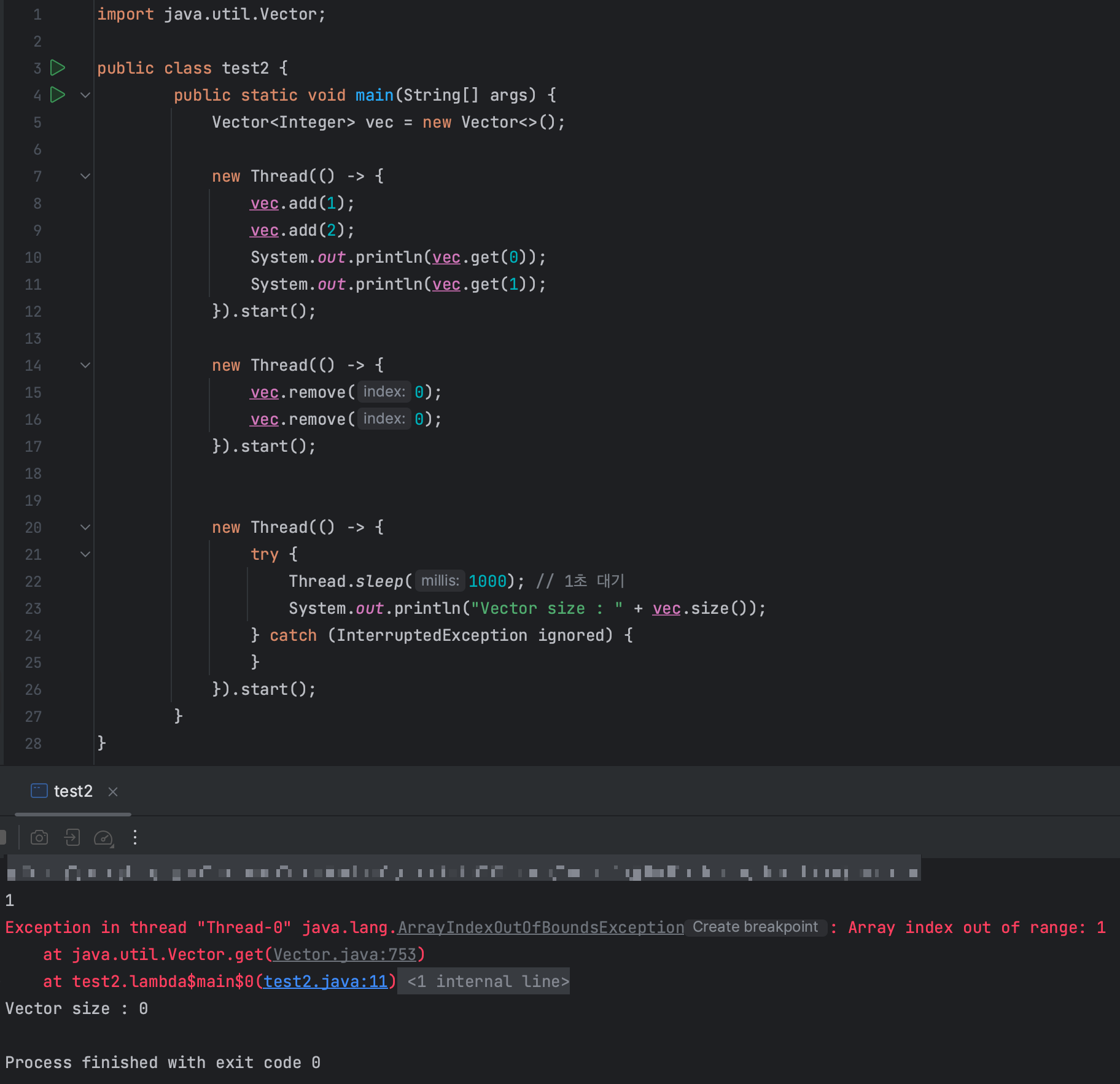 아래 코드는 첫 번째 스레드에서는 Vector에 값을 add하고 두번째 스레드에서는 Vector에서 값을 remove하며 동작하는 코드입니다.