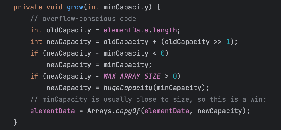 배열의 크기가 이전 배열의 크기보다 늘어야하는 상황이라면, 이전 elementData의 길이에 해당 길이의 반을 더한 길이를 리턴해주는 것을 볼 수 있습니다. ( newCapacity = oldCapacity + (oldCapacity >> 1); )