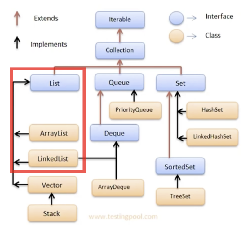JCF 계층 구조에서 ArrayList와 LinkedList는 아래와 같습니다.