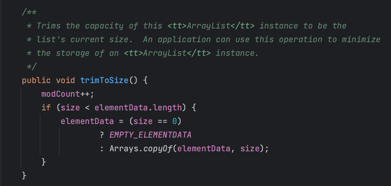 그리고 내부 구조를 구경 중에 trimToSize() 라는 익숙하지 않는 메서드를 발견했습니다.