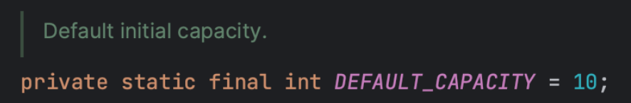 DEFAULT_CAPACITY는 ArrayList의 기본 할당 사이즈로 10인 것을 알 수 있습니다.