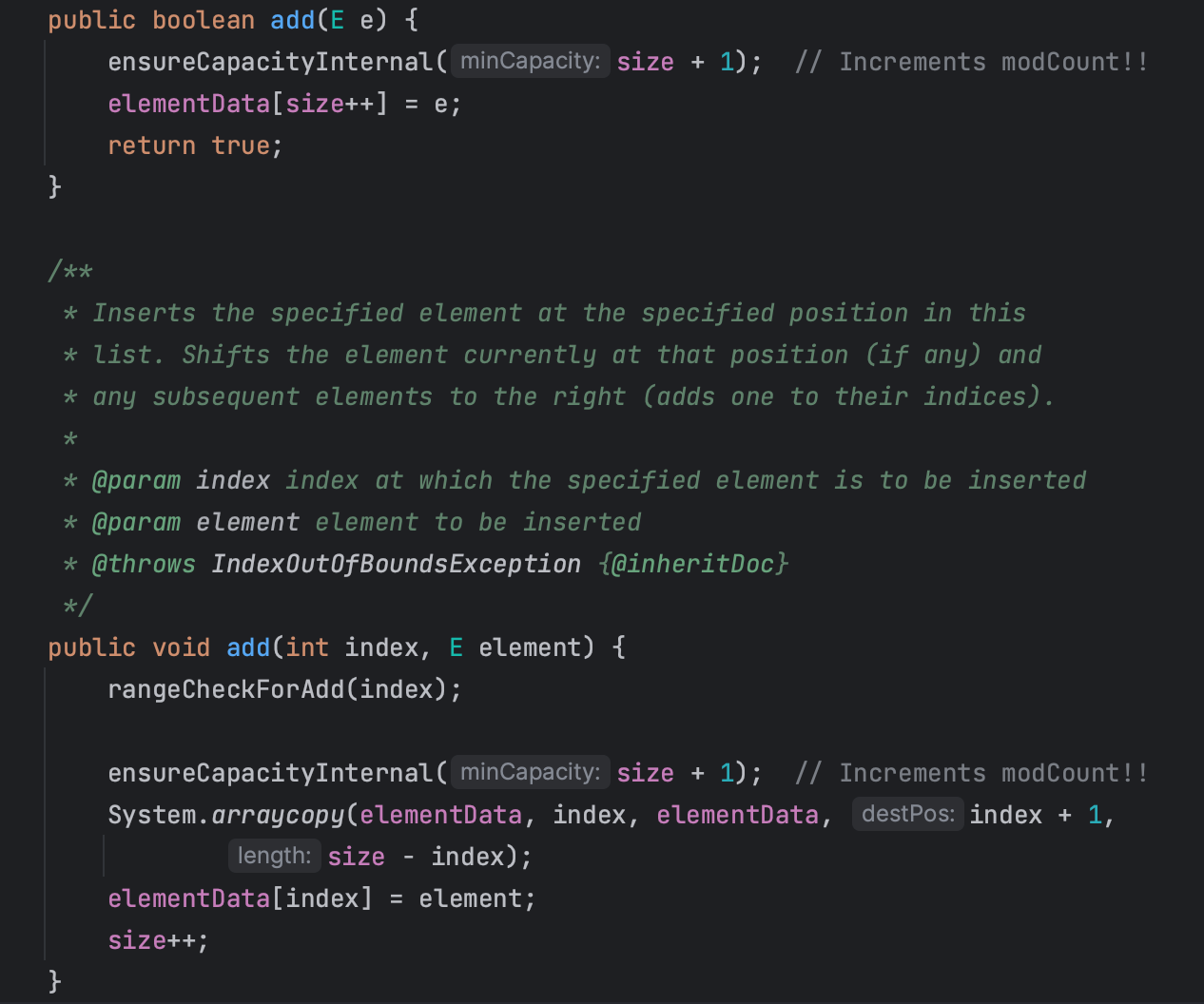 ArrayList에 add() 하는 내부 구현 코드를 살펴보겠습니다.