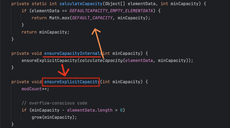그리고 두 메서드는 모두 ensureCapacityInternal()를 호출합니다.