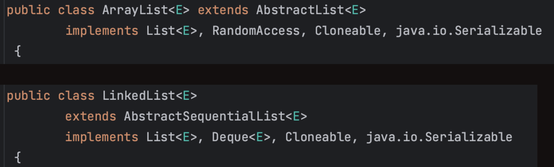 하지만 JCF 계층 구조를 조금 더 자세히 들여다 보면, ArrayList는 List 인터페이스를 구현한 AbstractList를 상속받고, LinkedList는 AbstractList 인터페이스를 구현한 AbstractSequentialList를 상속하고 있는 것을 알 수 있습니다.