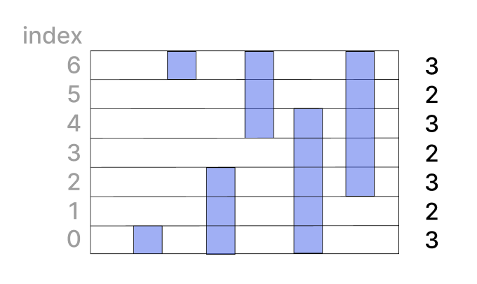 문제 상황을 위처럼 그림으로 나타내볼 수 있었습니다. 각 높이별로 파괴해야하는 장애물의 개수을 표시한 것입니다.