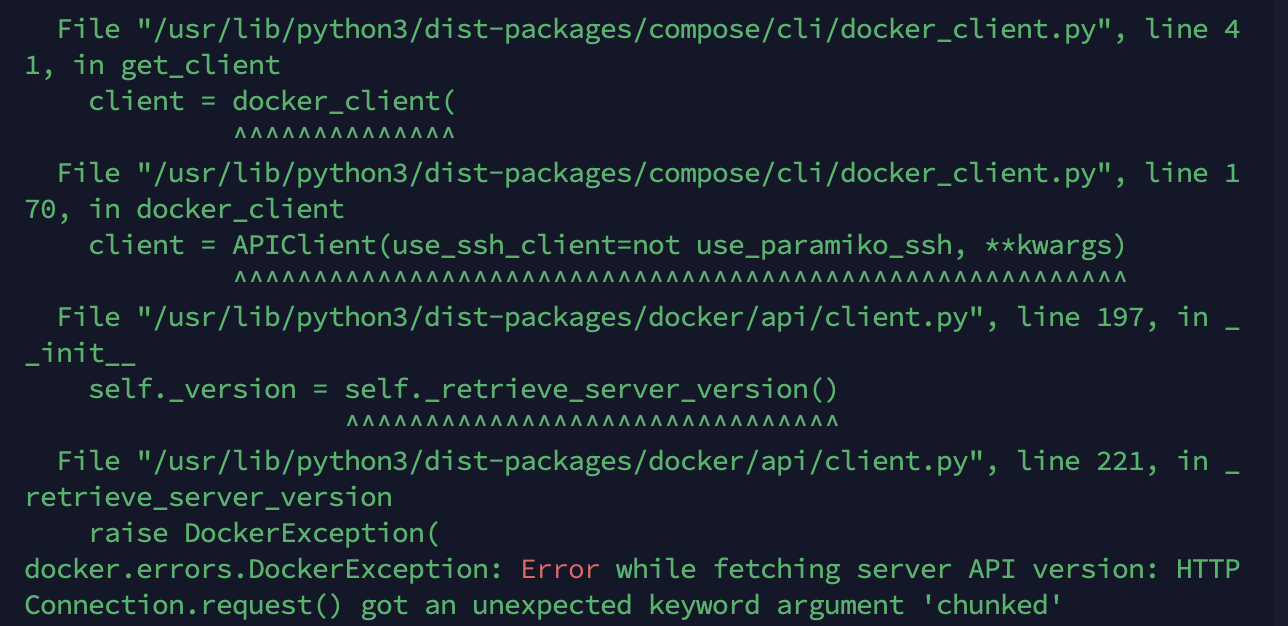 실제로 저의 에러 코드를 분석하면, 오류 메시지에서 Docker API와의 통신 중에 HTTPConnection.request() 함수에서 예기치 않은 키워드 인수 'chunked'를 받았다는 것을 알 수 있습니다. Docker와 Docker-compose 각각의 버전이 호환되지 않아 Docker compose가 모르는 인수를 받아 문제가 생기는 것이었습니다.