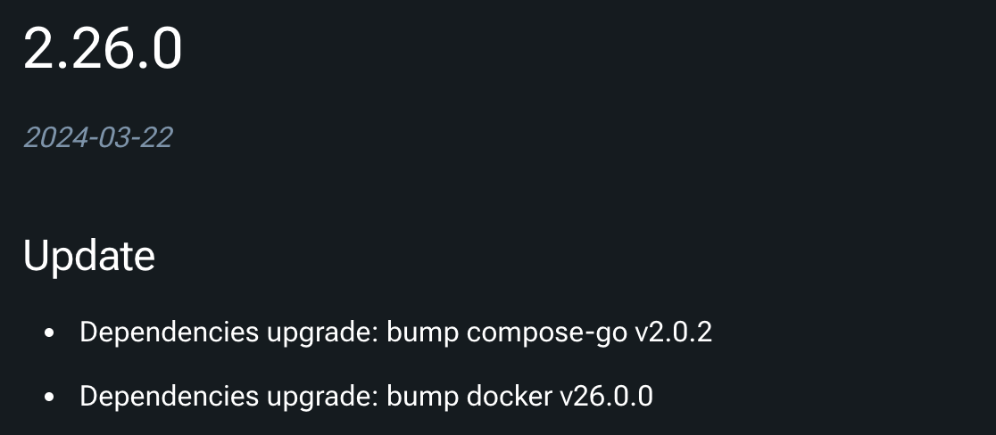 그리고 도커 공식 문서의 릴리즈 노트 기록을 참고했을 때, docker와 docker compose의 버전 의존성을 확인해볼 수 있었습니다.