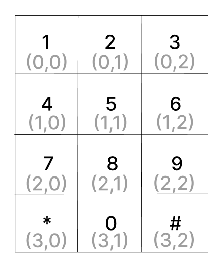 해당 번호를 각각의 행과 열로 표현하기 위해서 mod 연산과 나머지 연산을 이용했습니다. 그리고 예외적인 0과 *, # 는 따로 처리를 해줍니다.