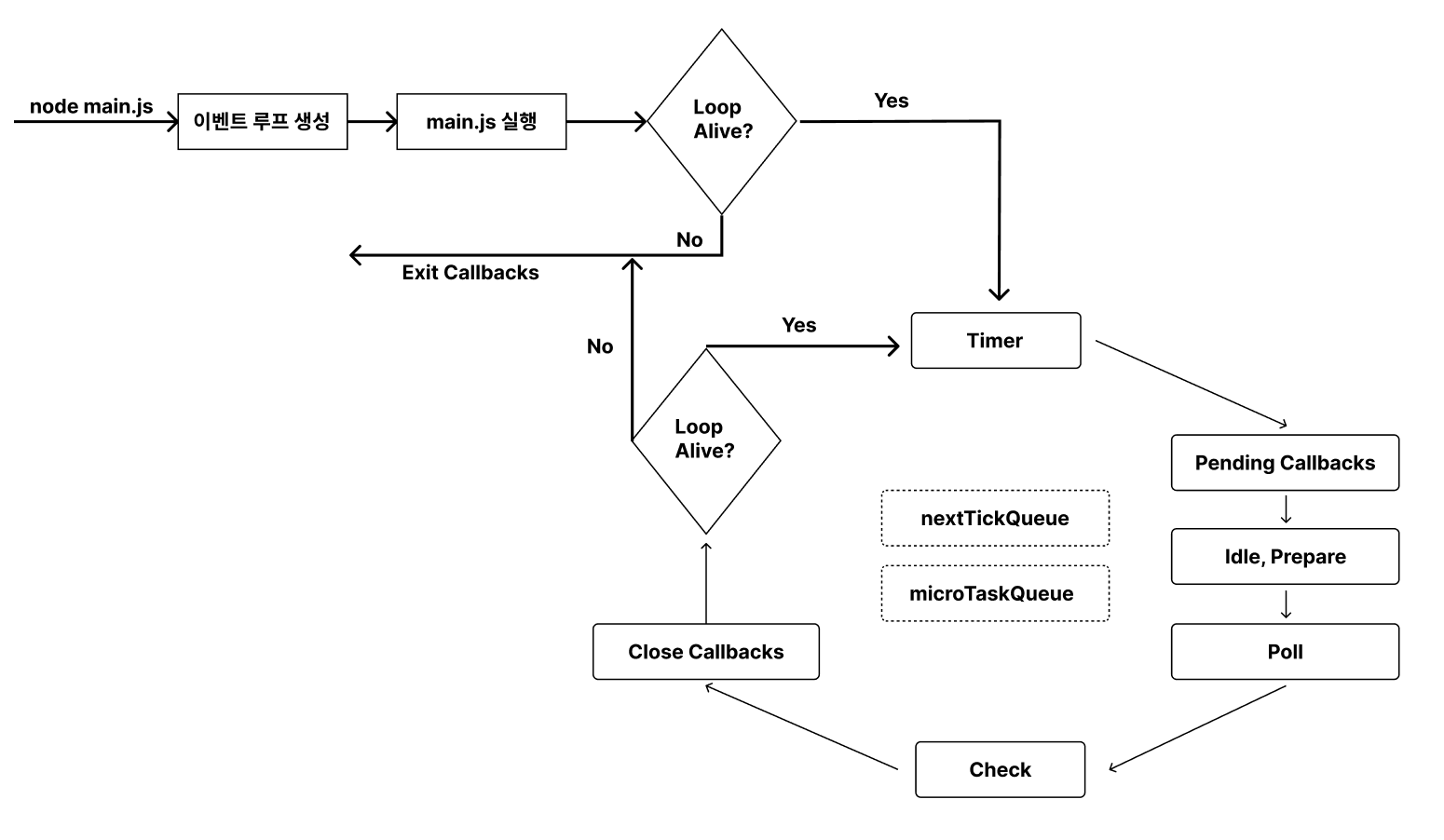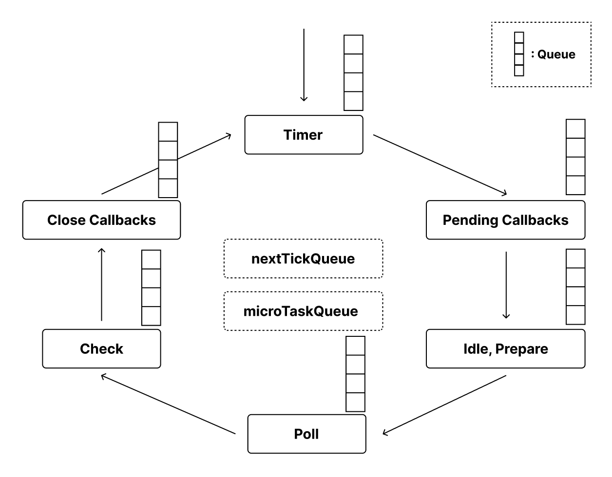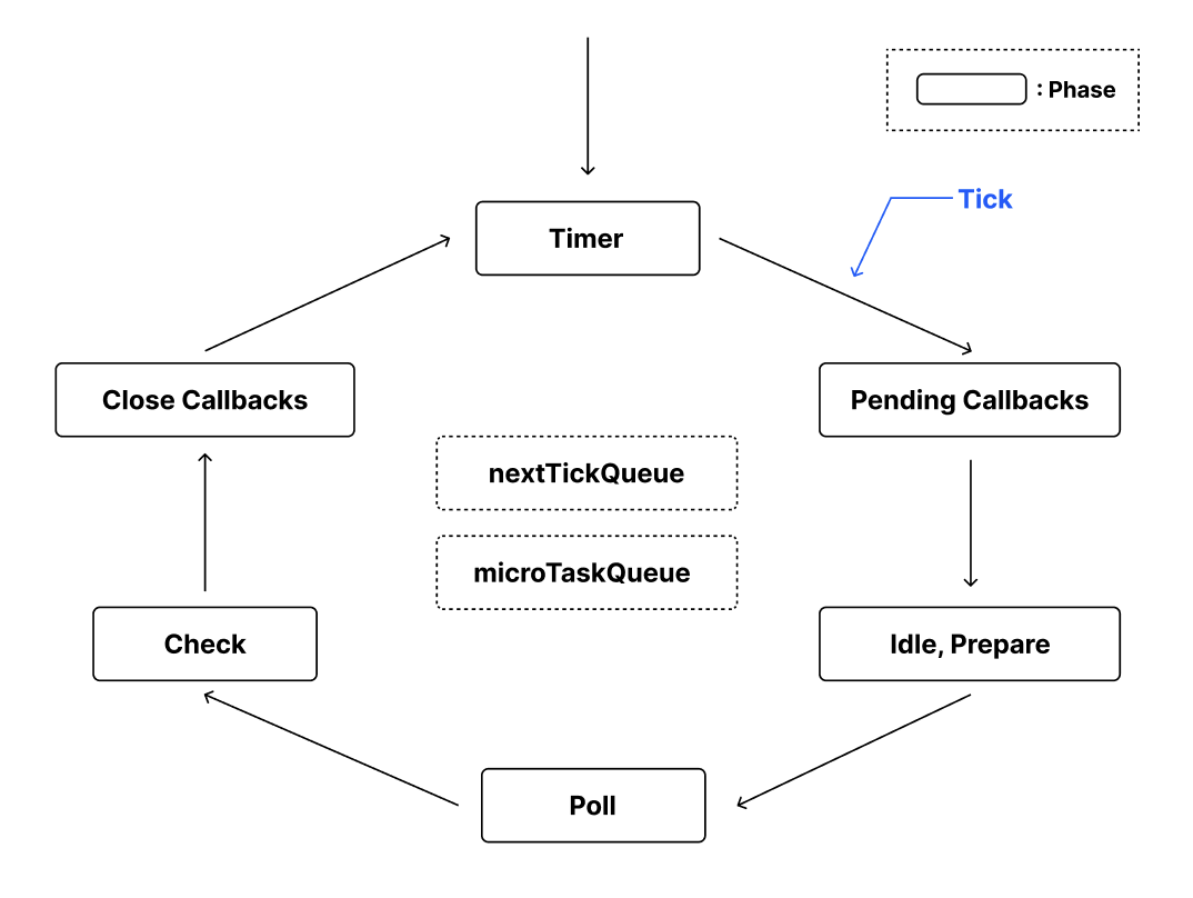 위 그림 중, 점선으로 구성된 nextTickQueue와 microTaskQueue는 이벤트 루프를 구성하는 요소는 아니다. 하지만 Node.js의 비동기 관리 작업을 도와주며, 이벤트 루프의 동작 방식에 영향을 미친다.