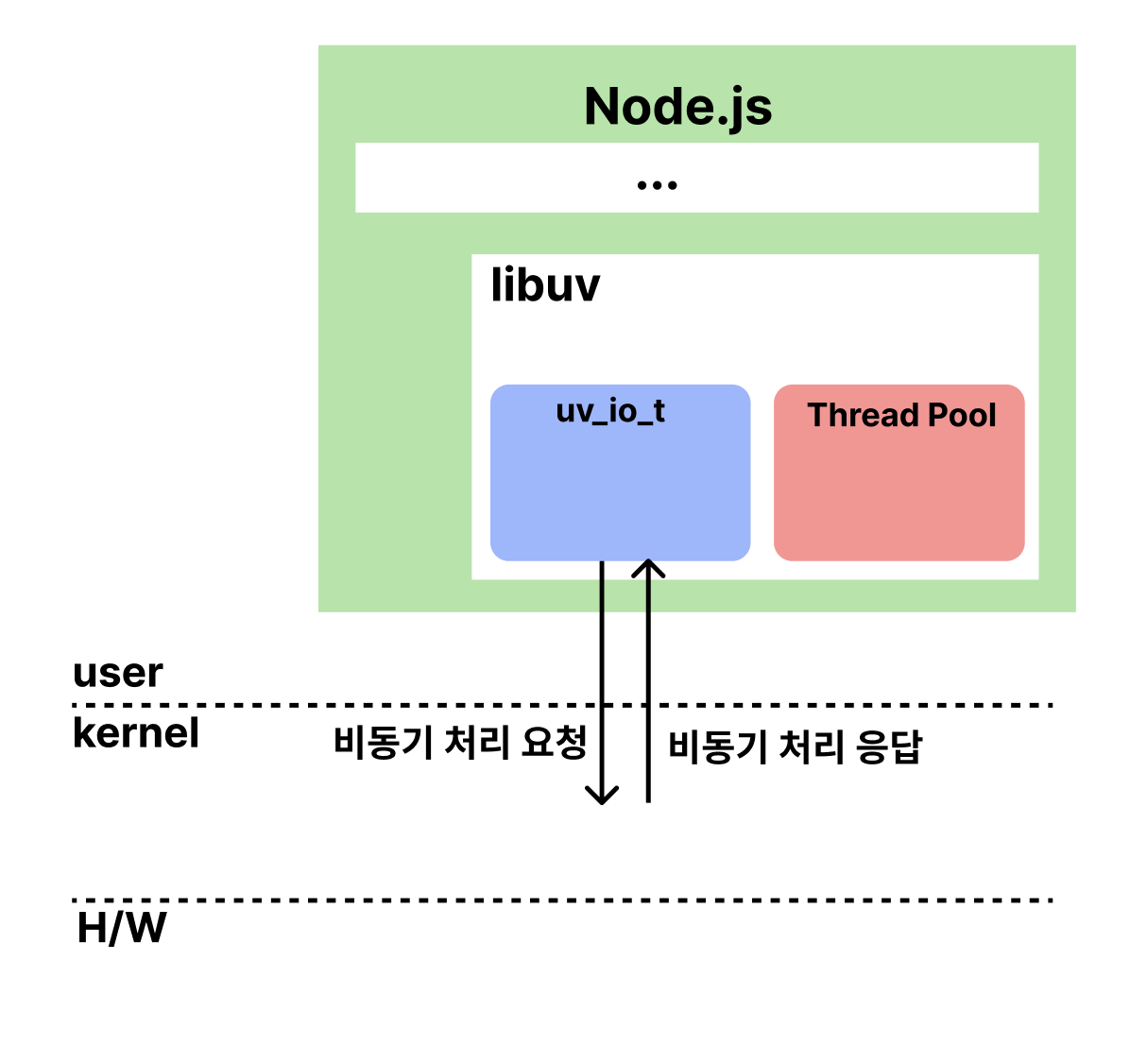 만약 커널에서 해당 비동기 작업을 지원하지 않을 경우, libuv의 스레드 풀이 직접 작업을 처리한다.