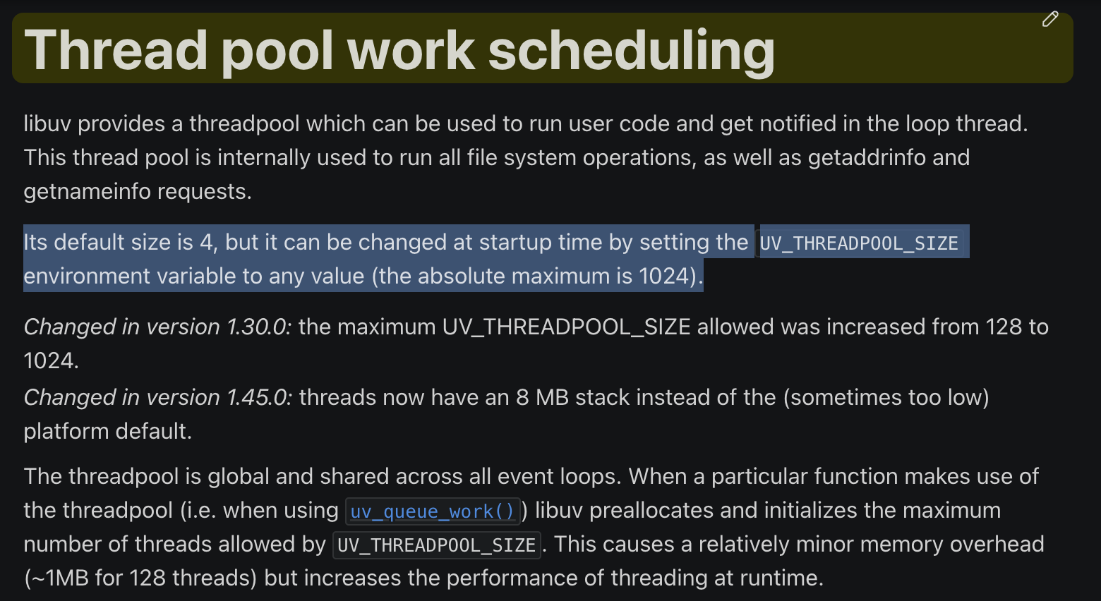 공식 문서에 따르면, libuv는 기본적으로 4개의 스레드를 가지는 스레드 풀을 생성한다. 그리고 UV_THREADPOOL_SIZE라는 환경 변수를 통해 최대 1024개의 스레드 생성이 가능하다.