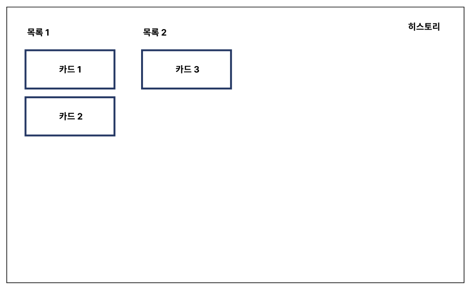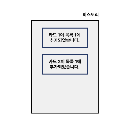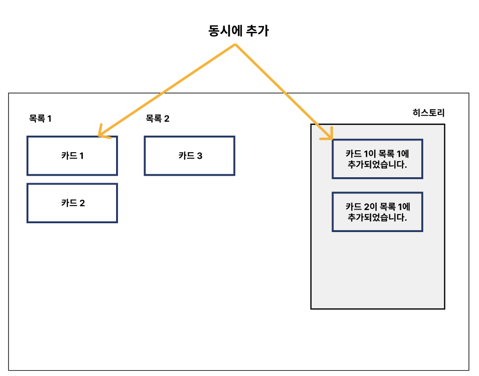 목록 1에 카드를 추가하면, 히스토리 판넬에도 동시에 기록이 추가되어야 한다.