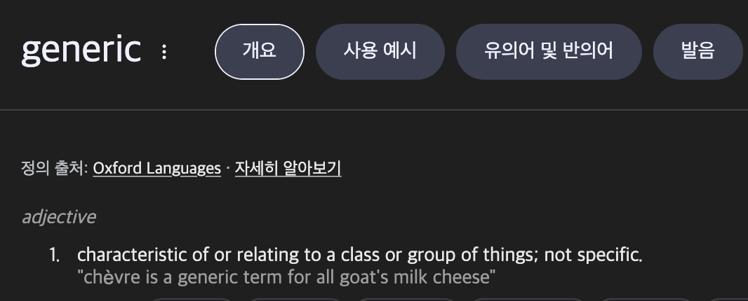 제너릭(Generic)을 영어 단어 그대로 직역하자면, 클래스 또는 사물 그룹의 특징 또는 이와 관련된 일반적이라는 것이라는 뜻입니다.