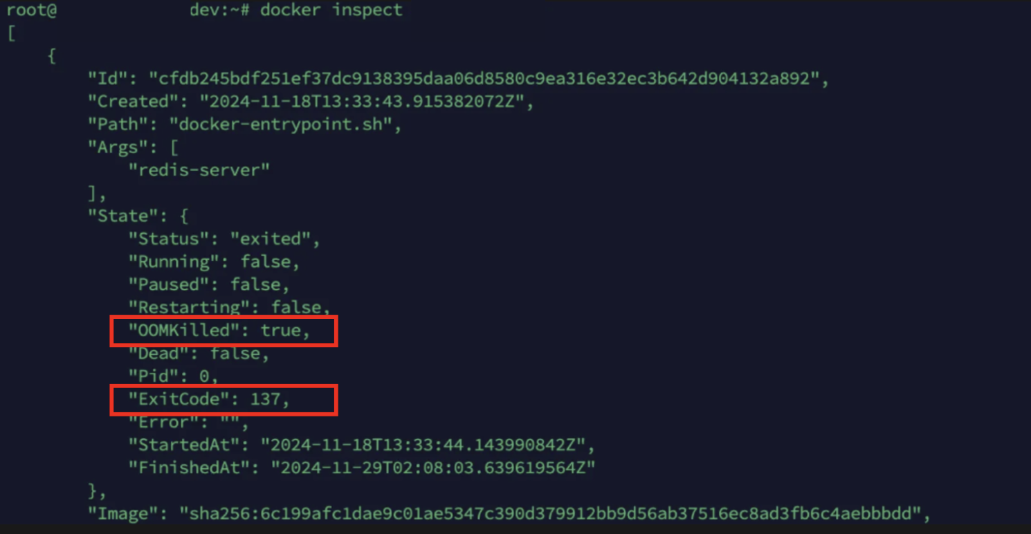 Redis 컨테이너도 종료되었는데, inspect로 확인해보니 아래의 OOM 에러 로그를 확인할 수 있었다.