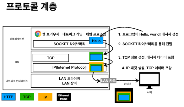 쉽게 그림으로 설명하자면, 만약 채팅 프로그램으로 Hello라는 메세지를 남기면 그 위에 TCP 정보를 한번 씌우고(녹색) 그 위에 IP 정보를 씌워(노란색) IP 패킷을 생성하는 것입니다.