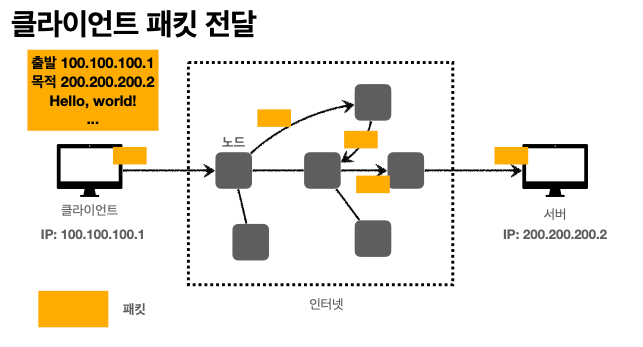 패킷에는 출발지 IP 주소와 목적지 IP 주소를 가지고 있습니다. 전송하면 네트워크 상의 노드를 통해 전달됩니다.