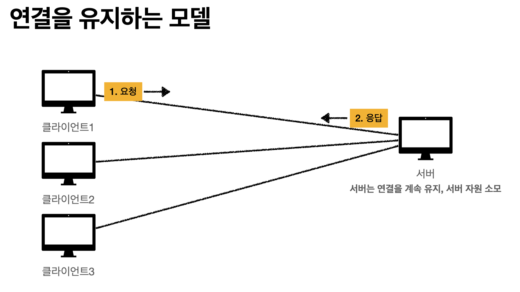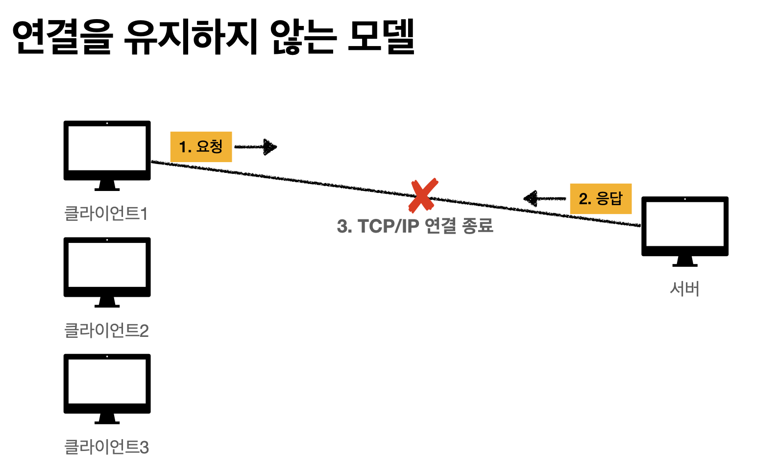 만약 클라이언트와 서버가 연결을 계속 유지하게 되면, 요청이 끝난 클라이언트와도 연결이 유지되기 때문에 서버 자원이 소모되는 문제가 발생합니다.
