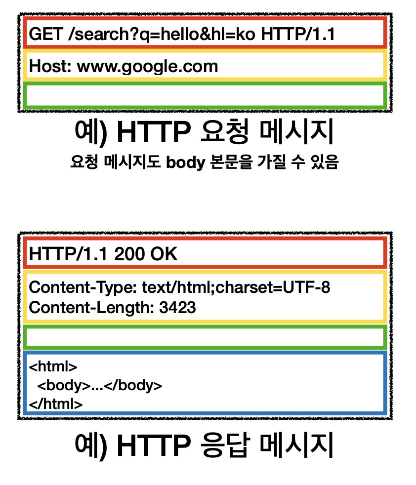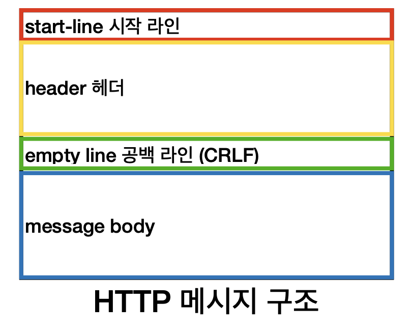 시작라인과 헤더(header), 공백 라인(CRLF), message body로 구성됩니다,