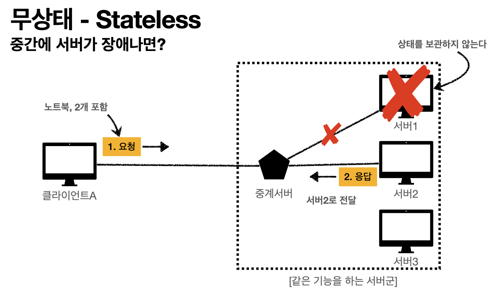 Stateless는 상태를 보관하지 않기 때문에, 중간에 서버가 장애가 나면 중계 서버가 다른 서버로 보낼 수 있습니다. 그럼 서버 2에서 정상적인 응답을 보내줄 수 있습니다.
