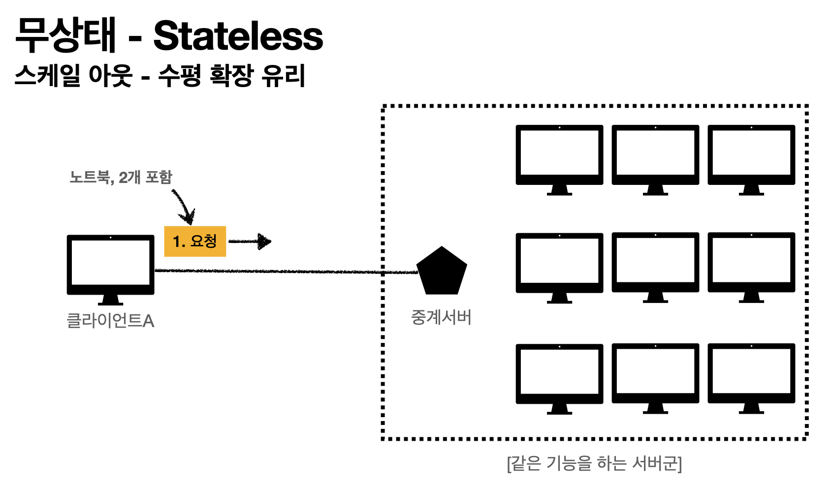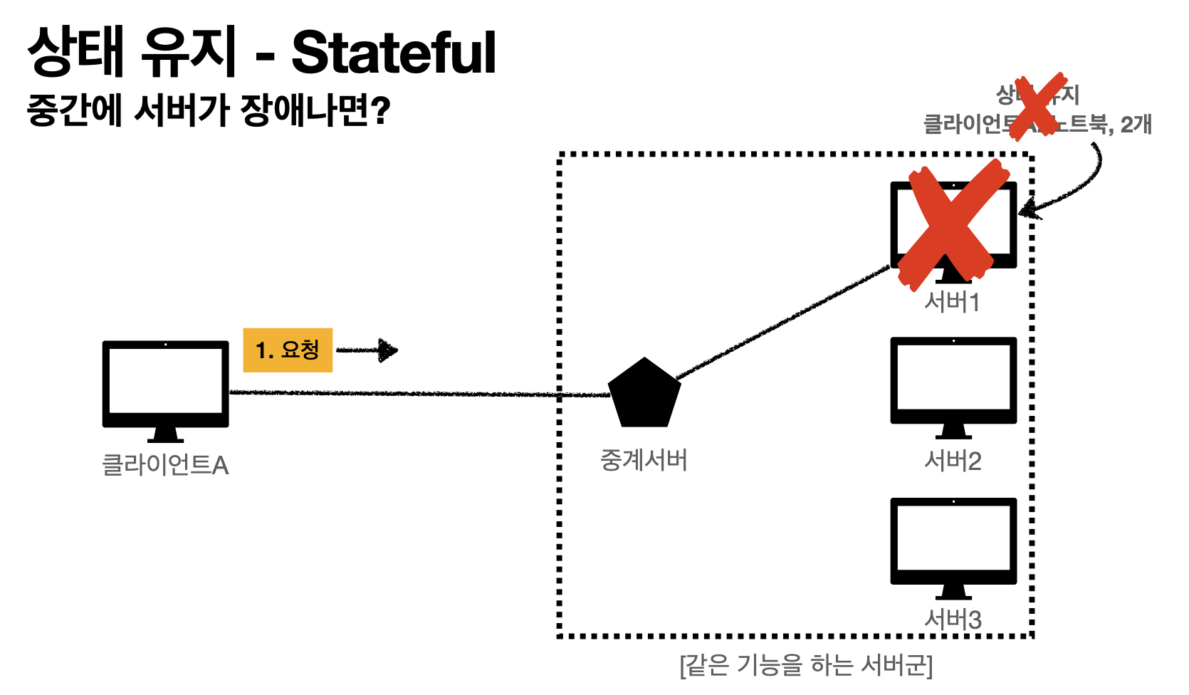 만약 Stateful 에서 중간에 서버가 장애나면, 클라이언트 A는 처음부터 다시 요청을 수행해야합니다.