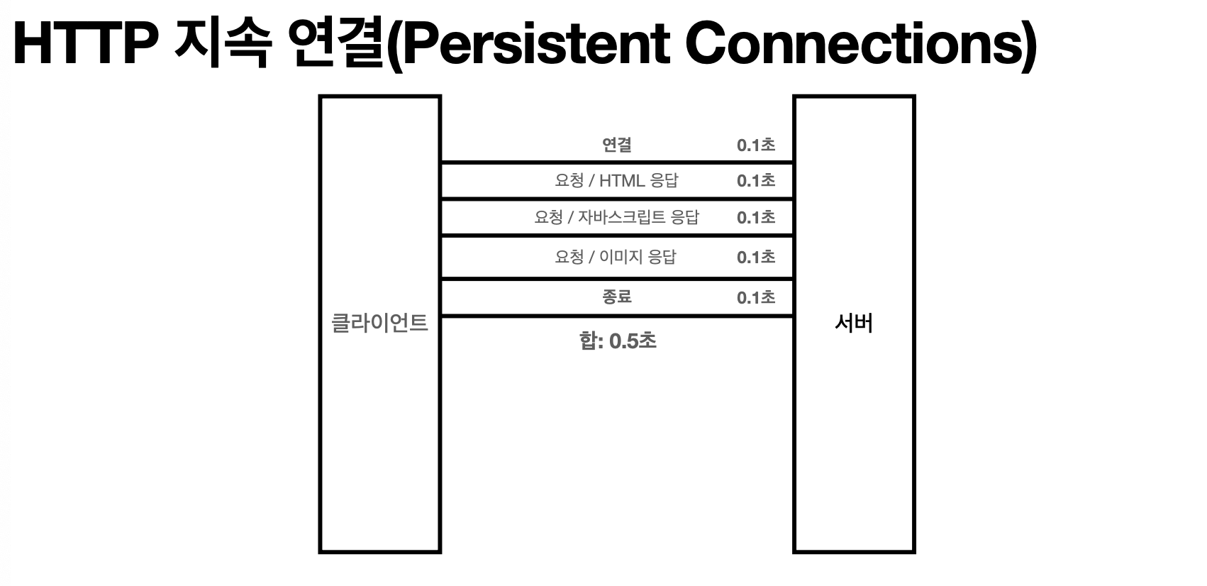 우선 TCP/IP 연결을 새로 맺어야 하는 것입니다. TCP/IP 연결을 맺는 과정에는 3-way handshake라는 시간이 추가됩니다. 이로 인해 초기 연결 설정에 시간이 소요되는 단점이 있습니다. 이를 극복하기 위해 HTTP/1.1에서는 Keep-Alive라는 지속 연결 기능을 도입하여 한 번의 연결로 여러 요청과 응답을 주고받을 수 있도록 했습니다.