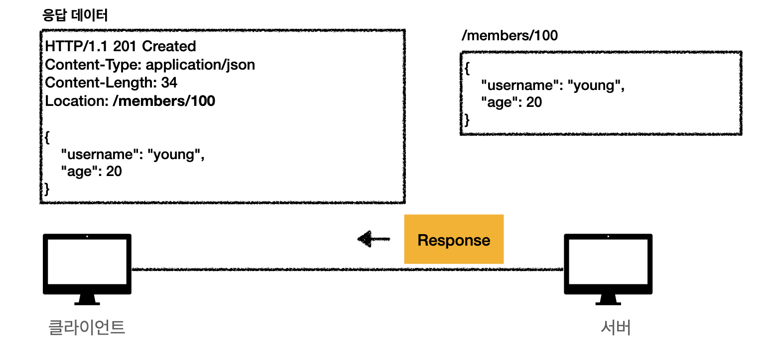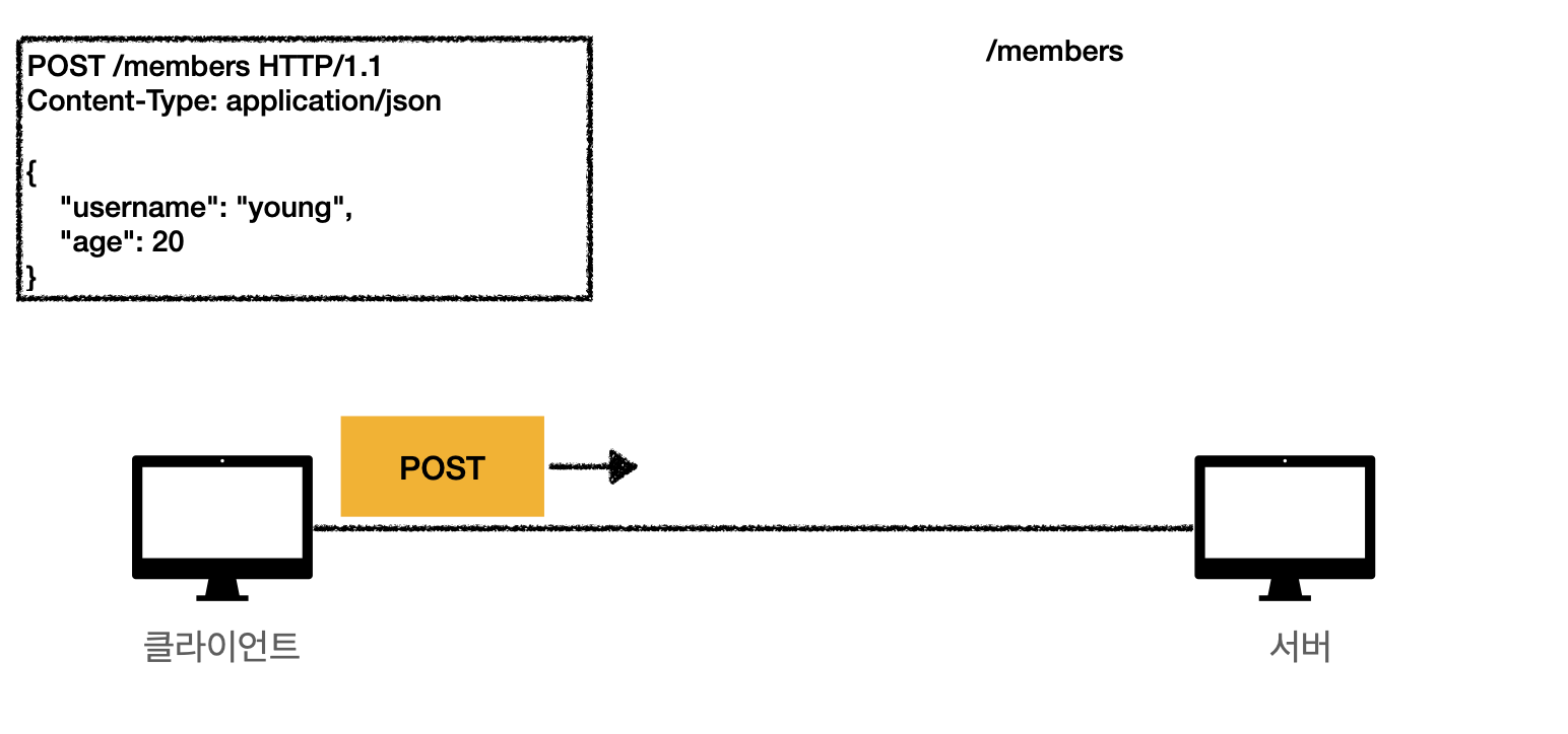 클라이언트가 서버에게 /members로 URI 요청을 보냅니다. 이때 메시지 바디에 필요한 데이터를 실어 보냅니다.