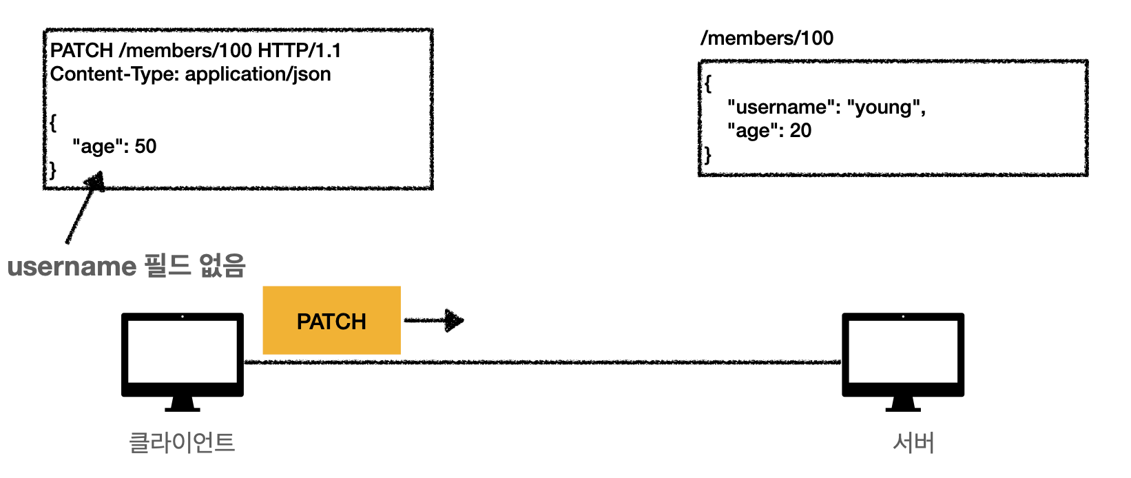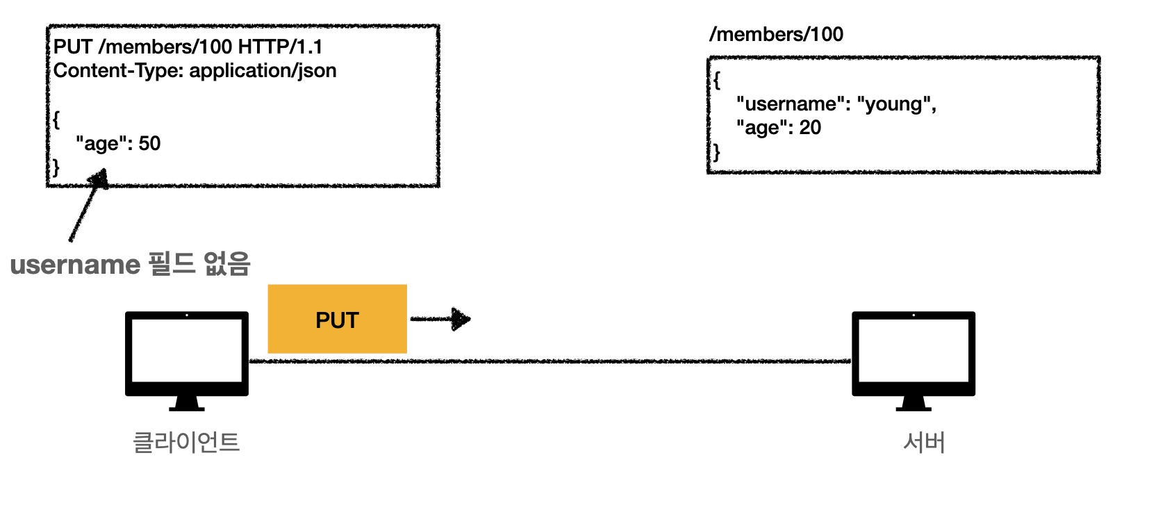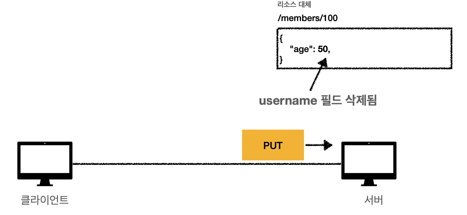 중요한 것은 리소스를 완전히 대체한다는 것입니다. 위 그림에서 username 필드를 없애고 age를 다르게 해서 서버에 요청하면, age만 변경되는 것이 아닌 모든 데이터가 날아가고 age만 남게 됩니다.