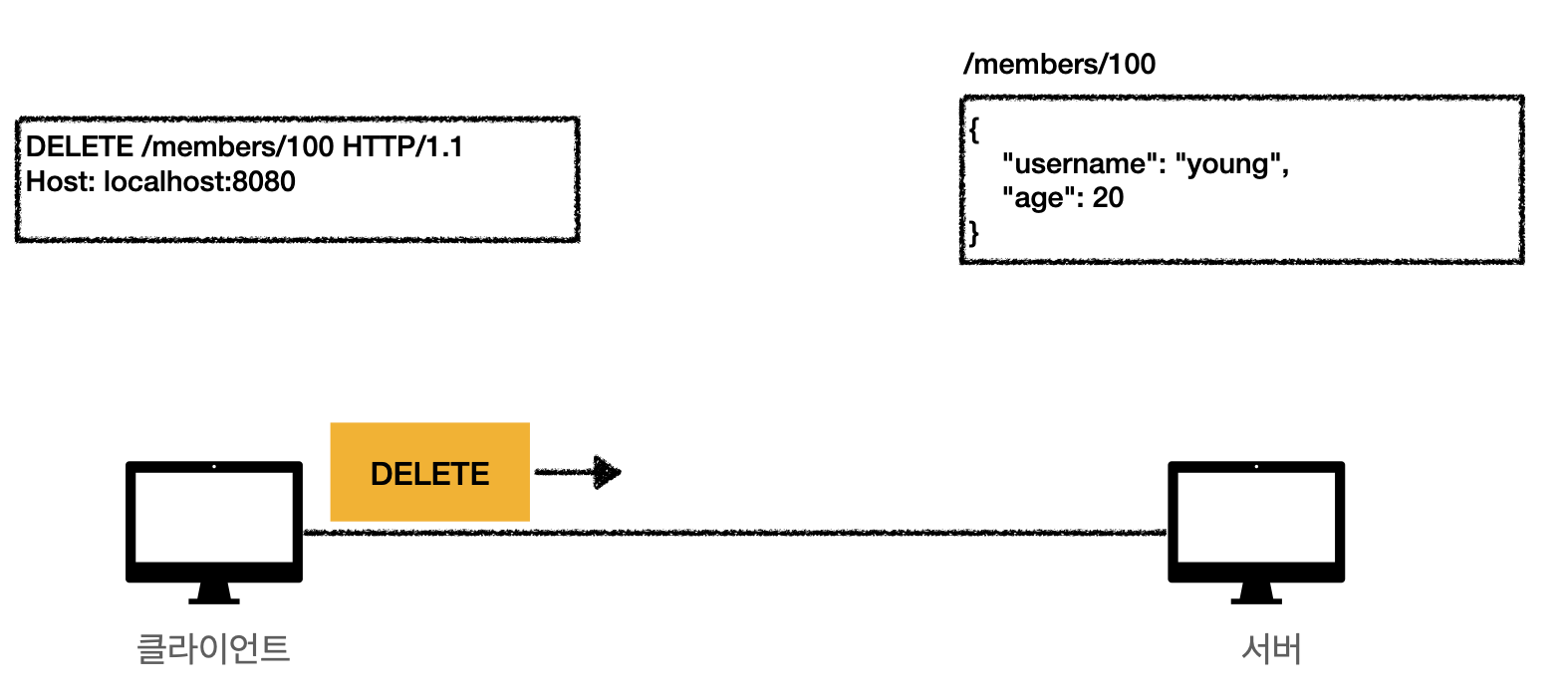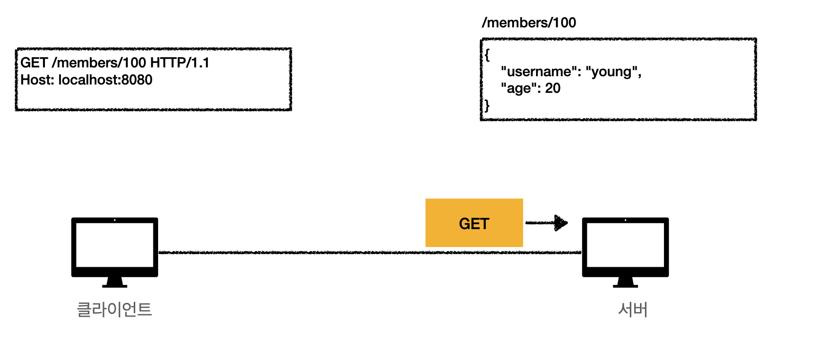 만약 서버에 위와 같이 GET/members/100 HTTP/1.1이라는 요청을 보낸다면, 서버는 100번에 해당하는 멤버를 가져옵니다.