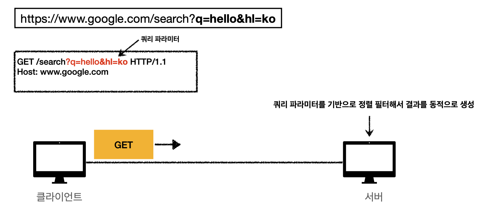 조회 시에 데이터를 전달해주어야 하는 경우도 있습니다. 예를 들어 구글에서 검색을 한다고 했을 때 검색어를 쿼리파라미터에 넣어서 요청하게 됩니다. 이처럼 주로 검색이나 정렬 필터 등에 주로 사용됩니다.