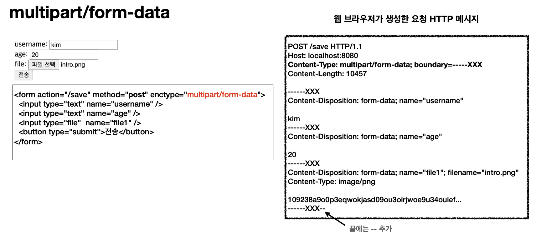 그래서 username과 age, file 이 바운더리로 나뉘게 되고 file에는 content type과 바이너리 코드가 함께 들어갑니다.