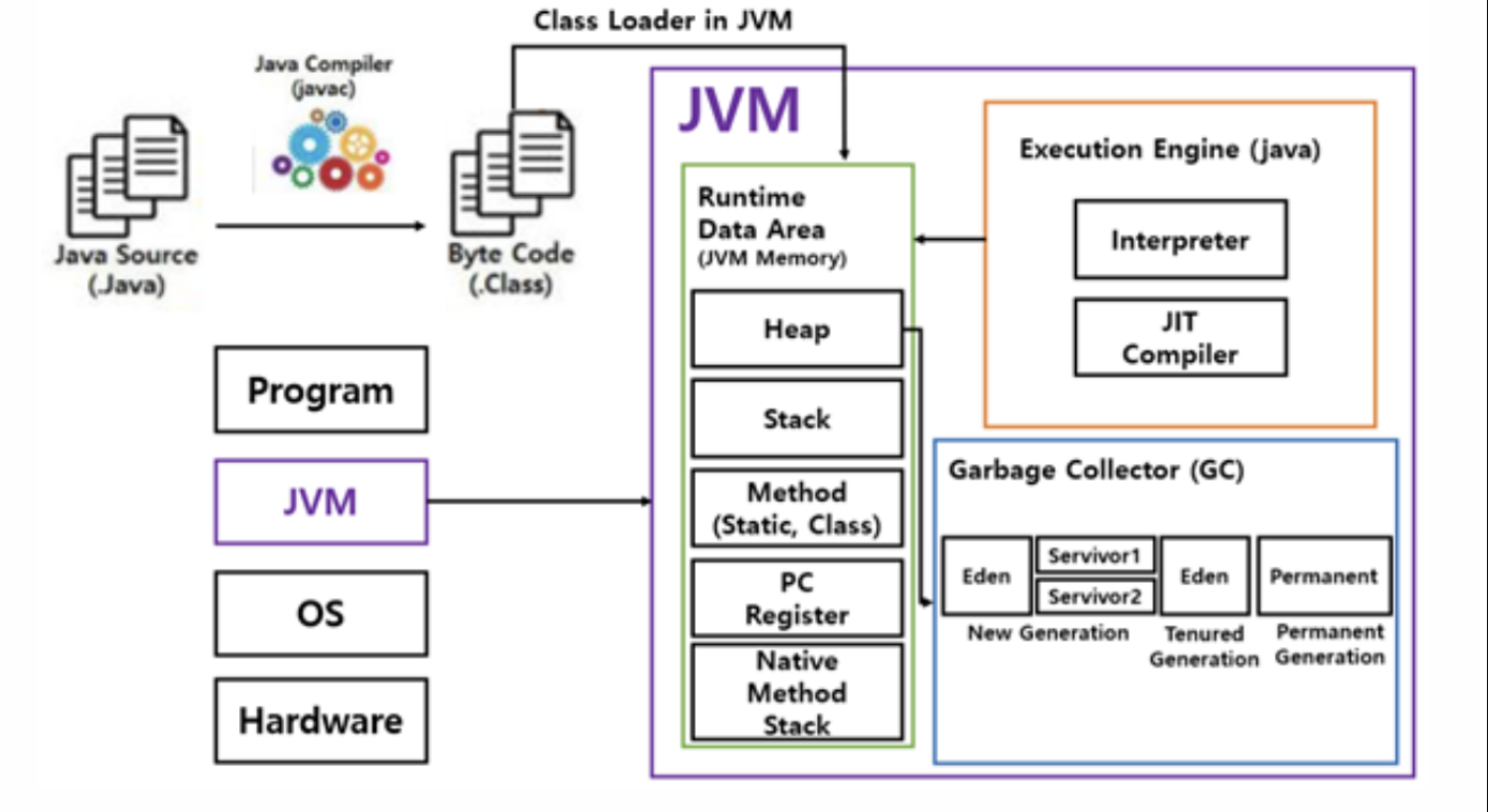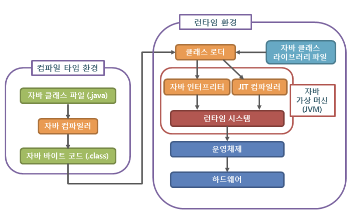 위 그림을 통해 다시 설명하자면, 자바 컴파일러가 자바 클래스 파일을 JVM이 이해할 수 있는 언어로 만드는 것이고, JVM은 내부 인터프리터와 컴파일러를 통해 어셈블리어로 변경하는 과정을 거친다.