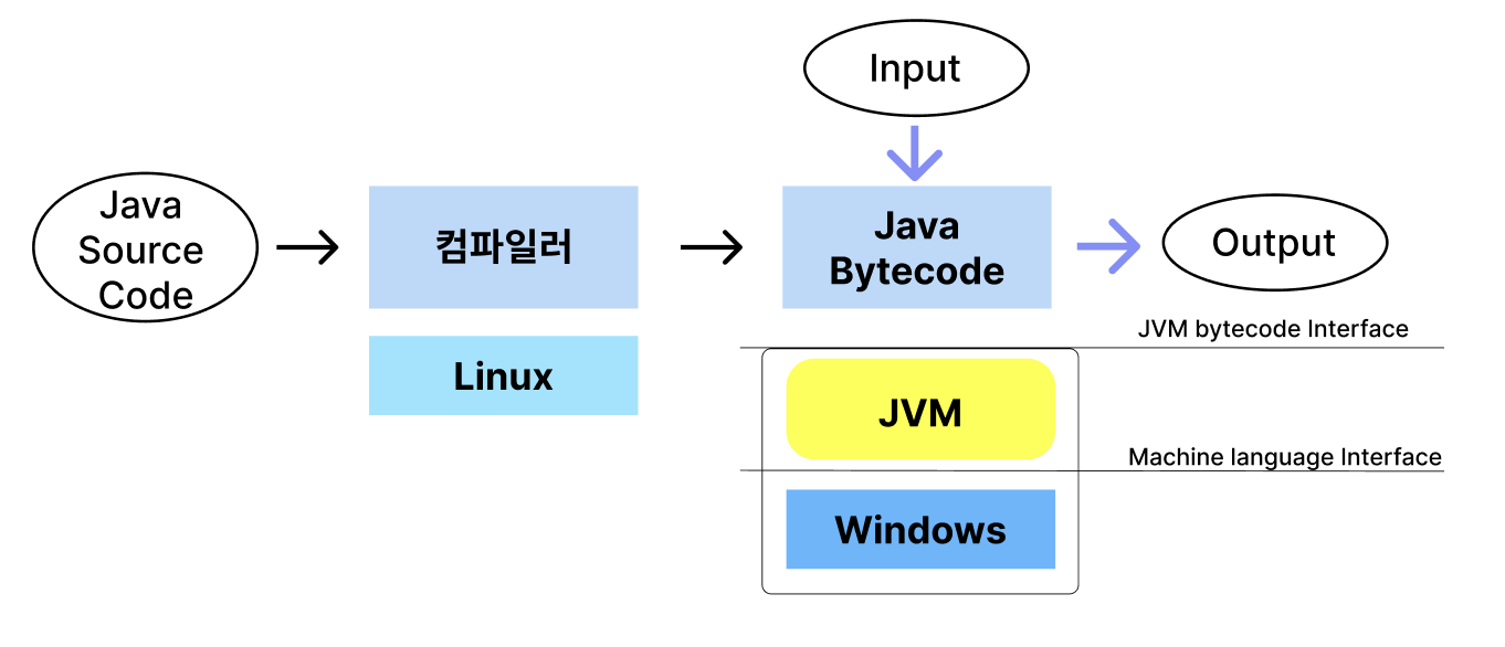 자바의 특징을 알면 자연스레 해결되는 질문이다. 자바의 가장 큰 특징은 플랫폼에 종속되지 않는다는 것이다. JVM(자바 가상 머신)이 이것을 가능하게 하고, JVM이 이해할 수 있는 언어인 바이트 코드로 변환하는 것이다.