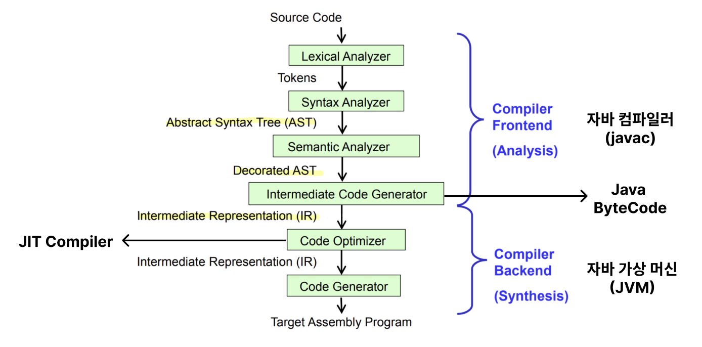 다른 C/C++언어같은 경우에는 모든 과정을 컴파일러가 진행한다. 반면 자바는 컴파일러의 프론트엔드는 Javac가 하고, 백엔드는 JVM이 함으로써 역할이 분리되어 있는 것이다!