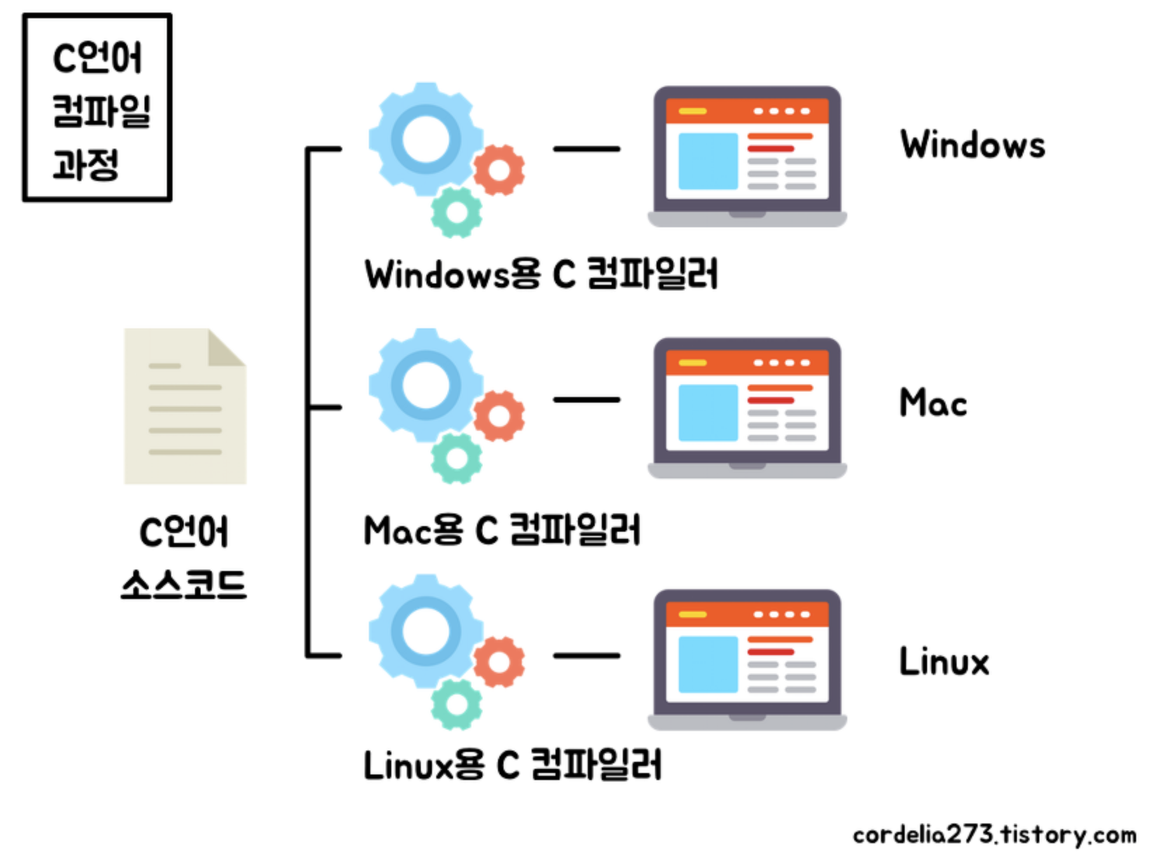 그래서 제작한 소스코드를 각각 운영체제에 맞는 컴파일러로 컴파일해서 실행시켜야만 한다. 그렇게 되면 프로그램을 윈도우, 맥, 리눅스 버전을 만들기 위해 각각의 컴파일러로 3번 컴파일을 해줘야하는 불편함이 생긴다.