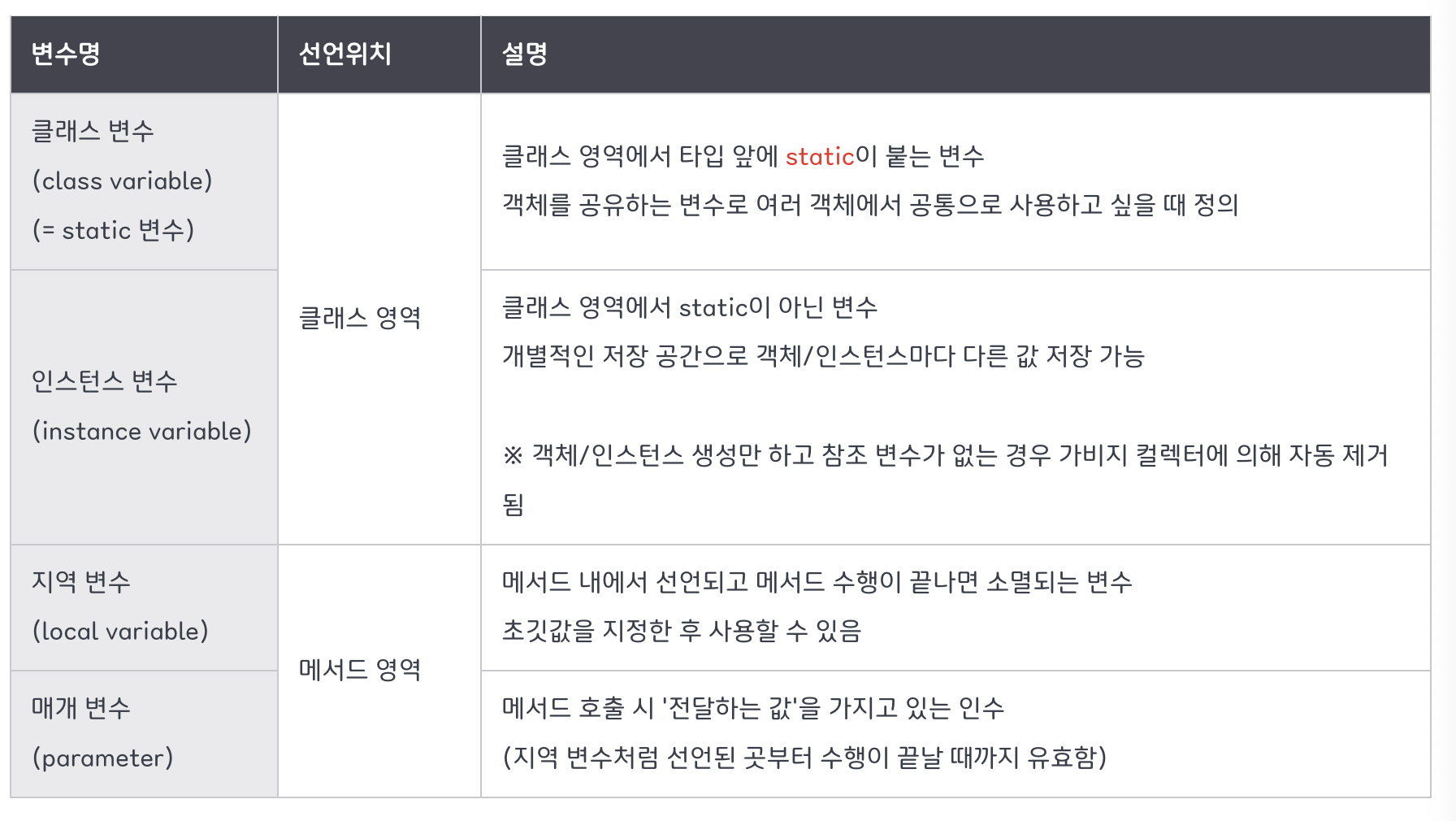 변수는 크게 네 종류로 변수의 선언된 위치에 따라서 클래스 변수, 인스턴스 변수, 지역 변수, 매개 변수로 나뉩니다.