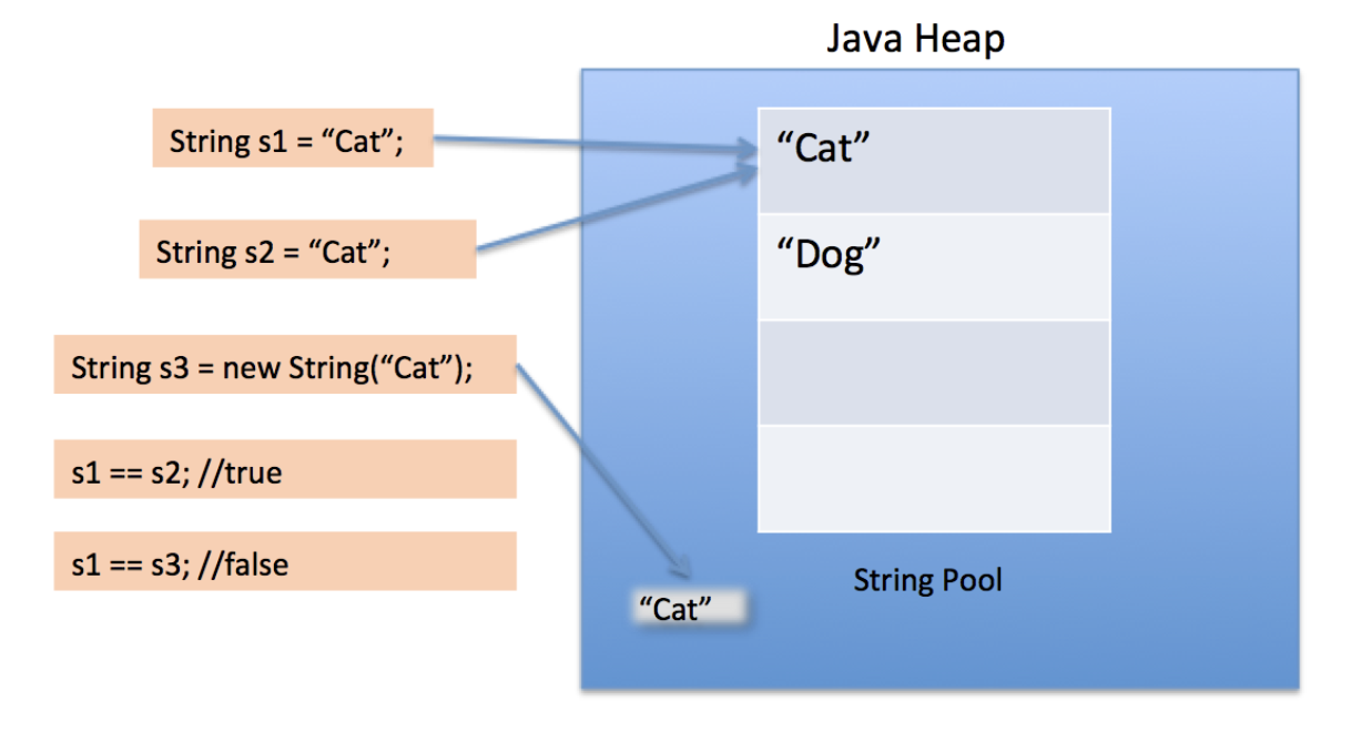 위 그림을 살펴보자. Heap 영역 내에 문자열 상수의 Pool을 가지고, 거기엔 사용자가 정의한 변수가 가지고 있는 값을 담는다.